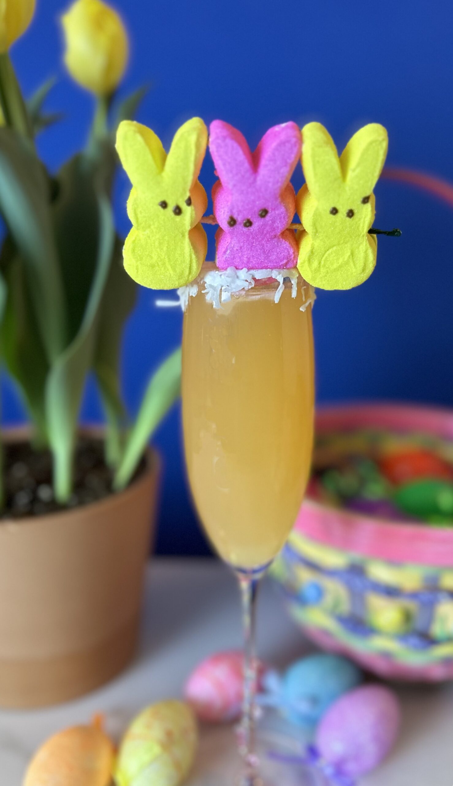 Nothing says Easter brunch more than a Mimosa (champagne and orange juice), so why not make it even more fun and festive with a Peepmosa! This cocktail/mocktail dual is so easy to make and a perfect Easter treat that everyone can enjoy. This delicious pineapple-orange cocktail features a marshmallow and coconut rim which represents the bunny’s fur and is garnished with an adorable peep. Peeps have been an iconic Easter candy for over 70 years. Can you guess what the most popular peep colors are? Yellow is number one followed by pink. Enjoy!